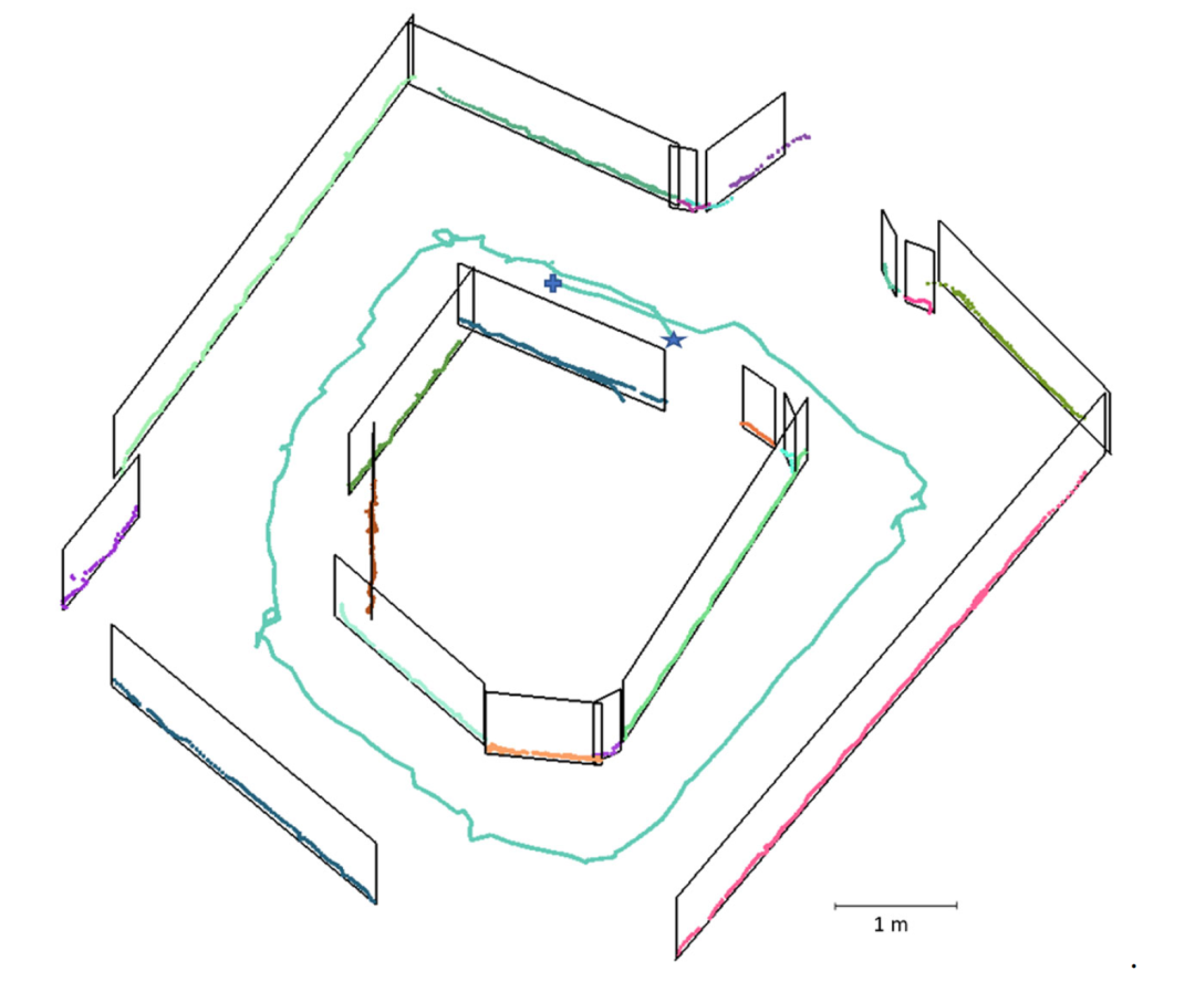 图6.ITC3 数据集的点云(颜色显示平面关联)与墙平面(黑线)的倾斜视图。蓝星和加号分别指轨迹的起点和终点(绿松石色)。出于可视化目的,未显示天花板和楼层点