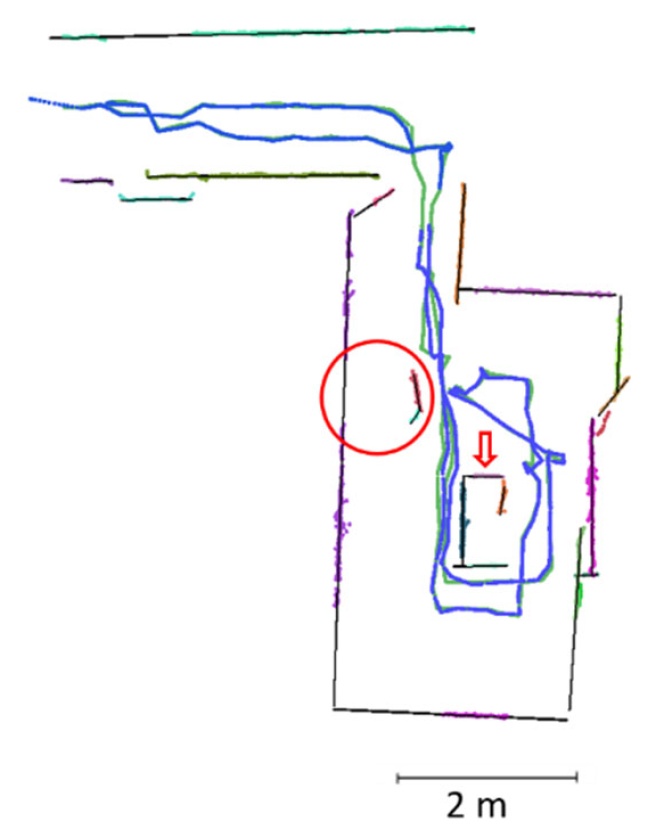 图9.DLR1数据集的点云(颜色显示平面关联)与墙平面(黑线)的俯视图。天花板点(蓝色)和地板点(绿色)在扫描空间的中间重叠。红色圆圈表示物体(打印机),红色箭头指向橱柜,参见图11