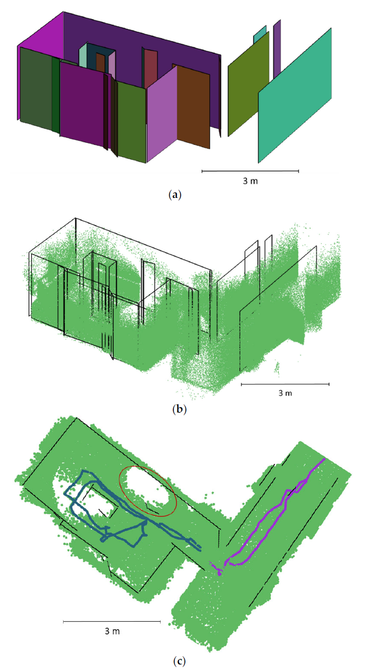 图 11.MAX和我们的DLR1数据集地图。(a)地图的倾斜视图(彩色边界框是指3D平面要素)。(b)MAX 3D点云(绿色)和我们的地图的倾斜视图(黑色边界框是指 3D 平面特征)。(c)MAX 3D点云(绿色)和我们的地图(黑色边界框指3D平面特征)的顶视图,其中点位于天花板的两个不同高度(蓝色和紫色)。红色圆圈表示对象(打印机)