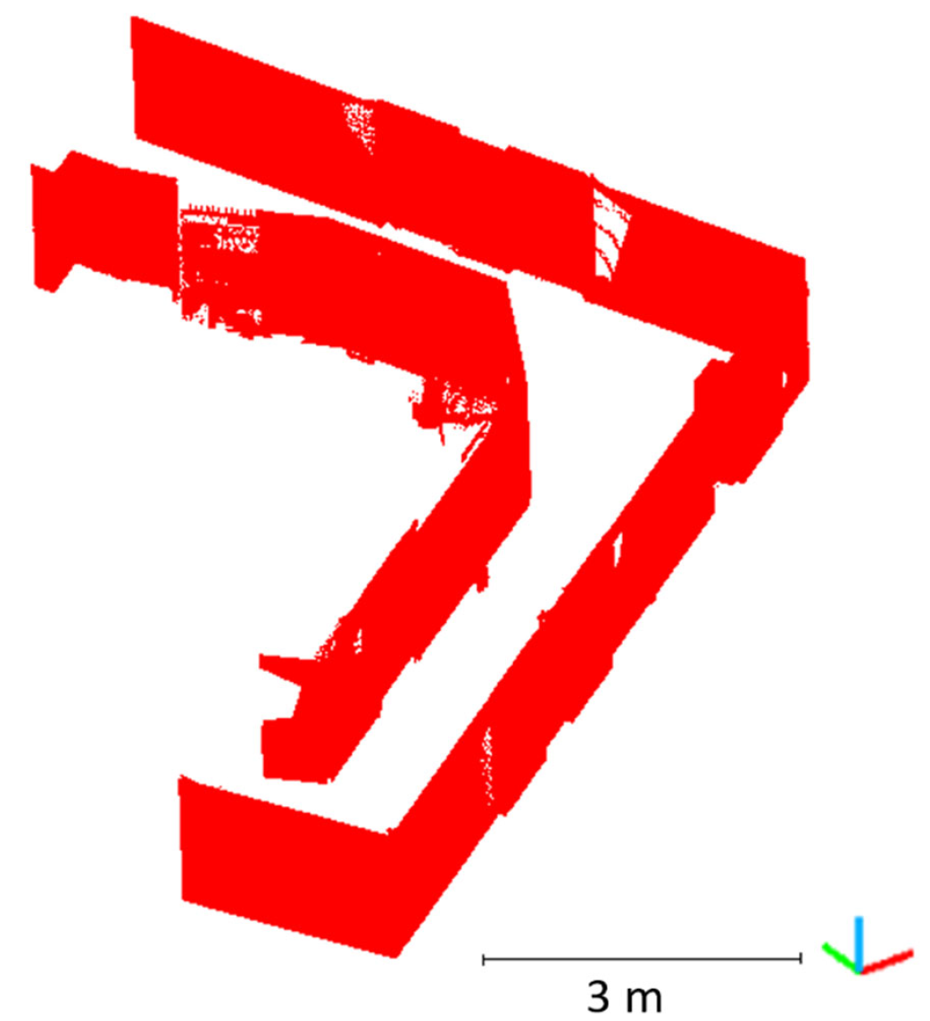 图5.ITC1数据集的TLS 3D点云的倾斜视图。出于可视化目的,未显示天花板和楼层点