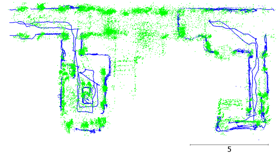 图12 DLR数据集的IPS 3D 点云(绿色)和点云(蓝色)的俯视图