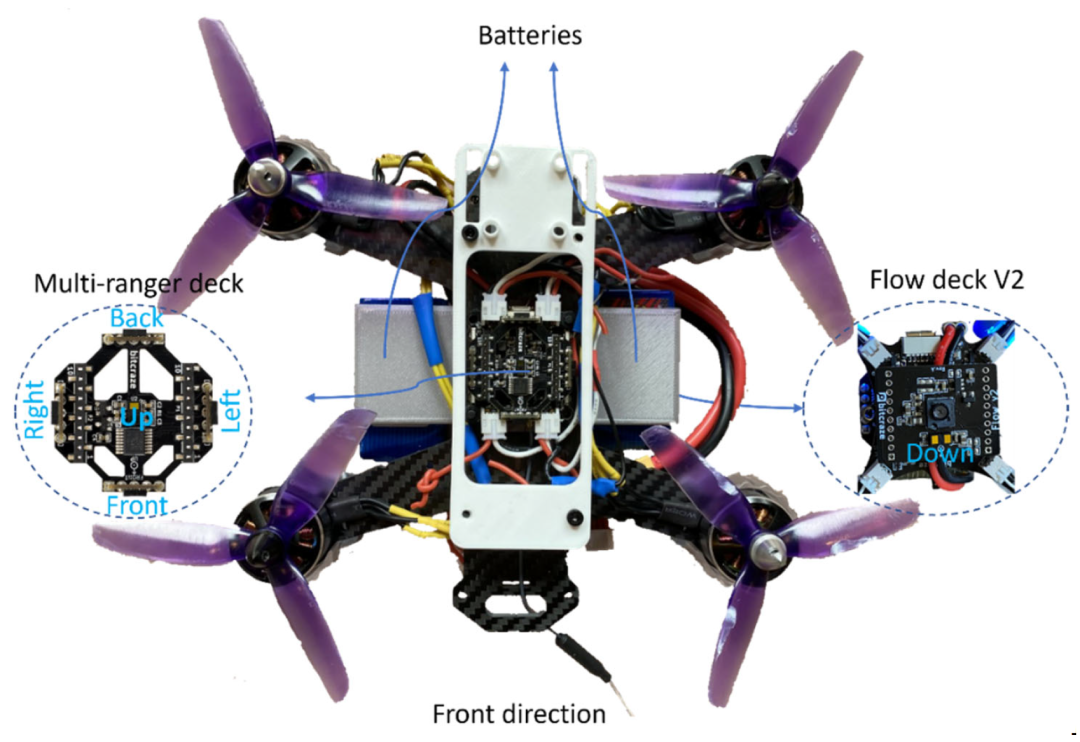 我们配置了一个微型无人机,带有一个用于测绘和避障的多范围甲板,以及一个用于测量水平运动的Flow甲板V2。两副牌都由Bitcraze出售。无人机的图片如图1 所示,它是一种四轴飞行器微型无人机,尺寸为182 × 158 × 56毫米,最大有效载荷能力约为 150克。微型无人机基于四轴飞行器配置,因为它的结构简单,控制稳定。