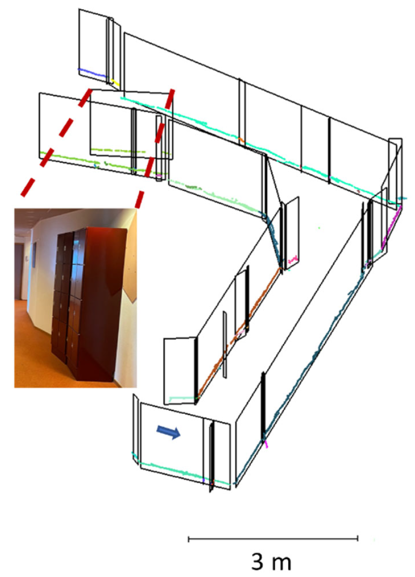 图4.ITC1 数据集的点云(颜色显示平面关联)与墙平面(黑线)的倾斜视图。蓝色箭头表示起始位置,红色虚线表示位于走廊中的橱柜。出于可视化目的,未显示天花板和楼层点