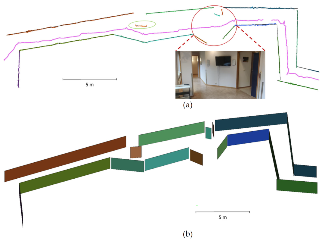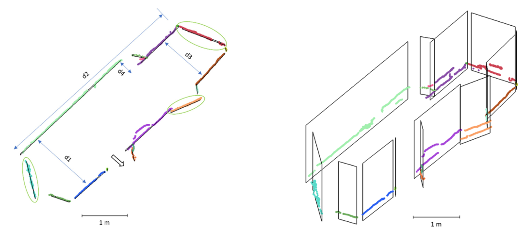 我们通过使用线分割算法,在预测的点云中独立地检测到每个边走廊的线性段,然后基于线性段提取平面段,假设墙是垂直的(图3)。对于垂直测距仪,使用表面生长分割提取平面段。