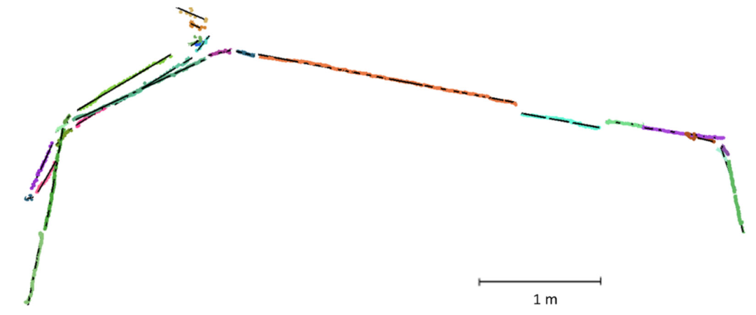 图3.左侧护林员在走廊左侧墙壁上捕获的激光点的俯视图。颜色显示平面关联,黑线表示提取的平面(2D 边界框)