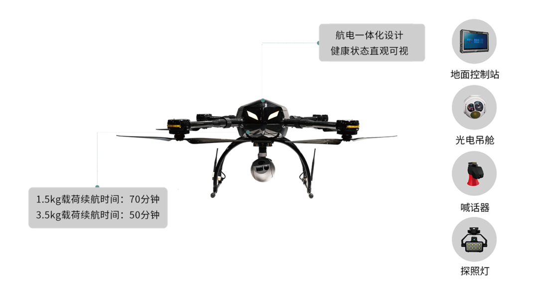 TA-Q12高原型无人机是联合飞机研制的一款小型四旋翼无人机,整机采用碳纤维材料一体成型,减少了大量复杂的连接件,具有机体轻、防水且可实现电子设备防护等优质性能。具有部署时间快、作业距离远、续航时间长等特点,最大起飞重量达15KG,可执行侦察、巡逻、搜救等任务。电池续航时间是无人机高原山区作业的主要制约因素之一,但这却难不倒TA-Q12。采用复合材料轻量化机身叠加配备高密度、高能效的锂电池;同时内置自抗扰等先进算法,保证飞行姿态的稳定,适合多种复杂情况,即使在6级风力、零下四十度、海拔5000米的冰雪高原极寒环境下依然能稳定飞行,实现60分钟持续巡航,破解目前四旋翼无人机在高原无法起飞的问题。