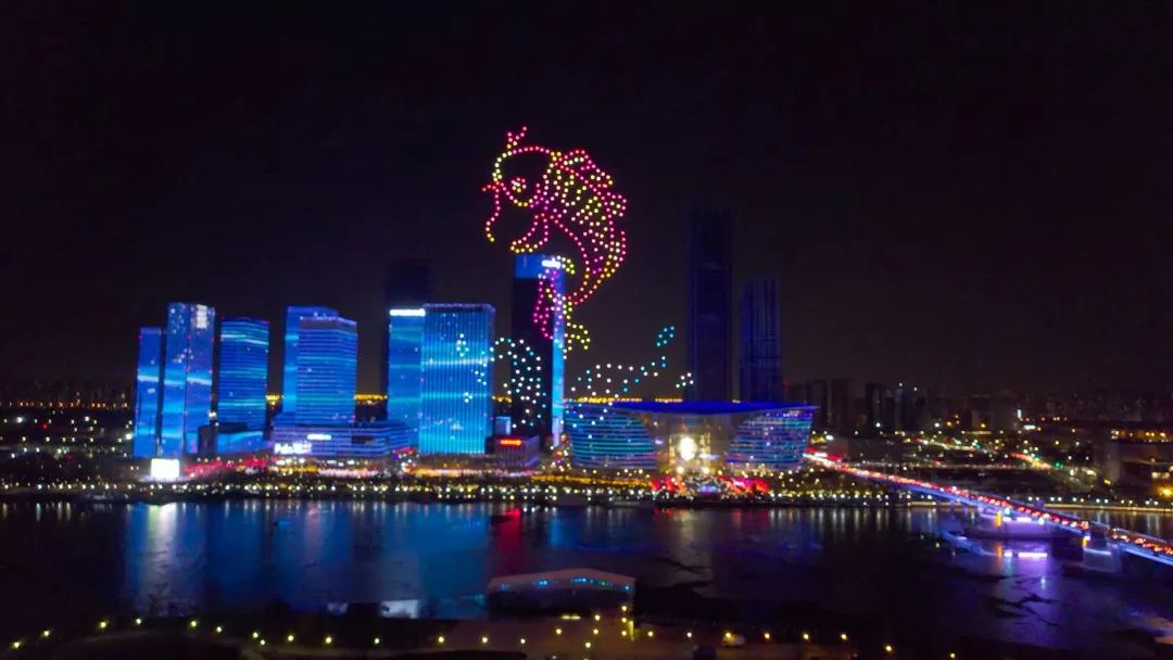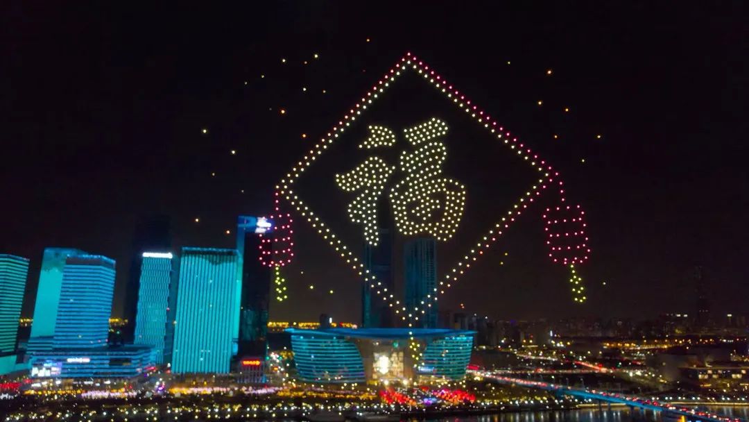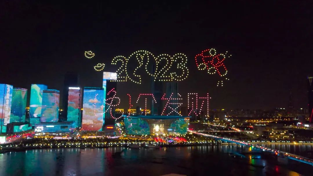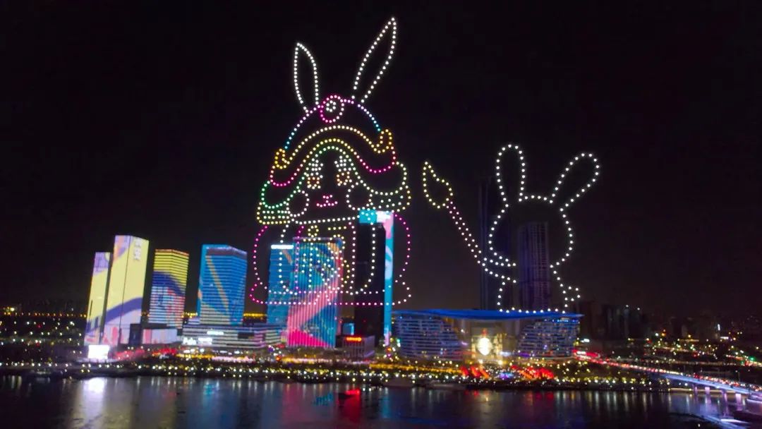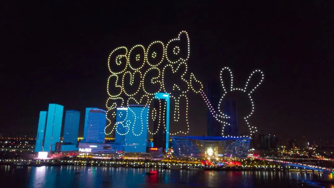 当晚19:30,800架无人机在夜空中冉冉升起,在空中打造出多幅迎新年画面,包括“鲤鱼跃龙门”、“兔爷迎新年、玉兔闹新年”、“魅力滨城 绽放于响”等,以科技创新与文化传承深度结合的硬核方式,为天津人民带来一场安全、环保、高效的科技光影文化盛宴,和津城人民一起迎接欢乐、祥和的新年!