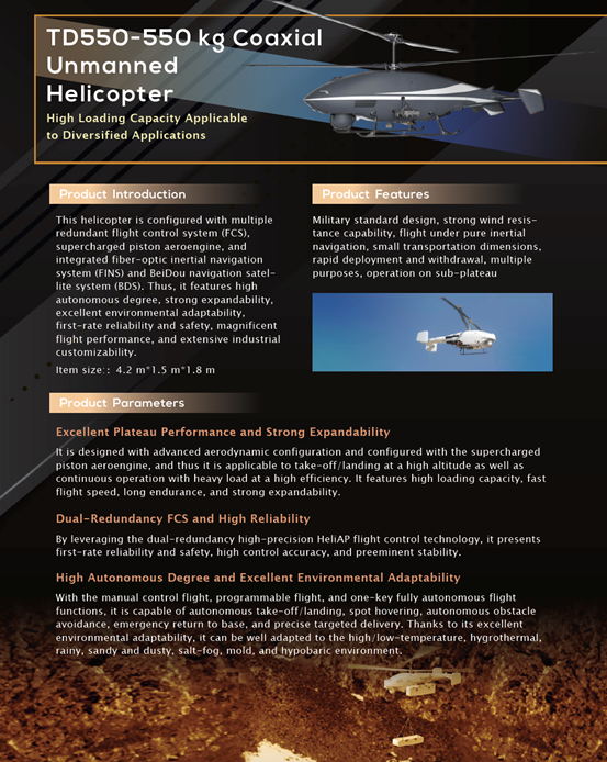 首次亮相阿布扎比防务展的TD550高原高速无人直升机,拥有强大的环境适应能力,一经亮相便吸引了一大波国际粉丝。无论是山区、高原、沙漠、戈壁、雪山、峡谷等多种复杂地理环境,还是高低温(-40°~+55°)、湿热、中雨、沙尘、盐雾等多种复杂的气象环境,TD550都能完成持续性作业。整机最大平飞速度可达180km/h,续航7小时、抗风6级;还能配装多种大载重挂载设备,任务拓展性强,实现飞行性能和任务能力的多面突破。
