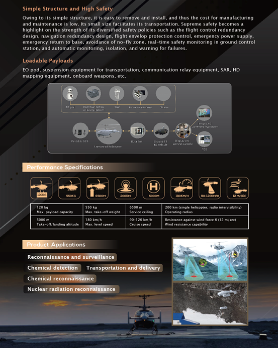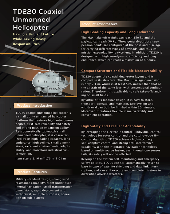 第二个重磅展品是我国第一架电控共轴无人直升机TD220 ,采用共轴双旋翼布局设计,结构紧凑,其尺寸较同级别常规构型直升机缩小50%以上,机动灵活,可快速展开撤收;对起降场地要求低,陆地、海上等多种复杂环境中都可以使用。虽然TD220身姿小巧,却拥有历经十年沉淀的非凡能力。机头、机身拥有三个通用挂点,配载类型丰富,任务拓展能力强,最大航时可达5小时。自主研发的飞行控制系统和电控共轴技术,让TD220 拥有更高的安全性、良好的适应性;智能化的设计,操作简单,使用便利。早在2015年,TD220就成功应用在我国海关缉私领域,成为我国海关应用的首款无人直升机。此外,TD220还成功应用于警用巡逻、消防救援、边境巡察、生化探测、通信中继等防务领域,以及电力巡线、航空物探、航空测绘、航拍航摄、石油勘探、物质运投、农林植保等民用领域,成为中国领先的一款智慧、易用、高效、经济的重载荷无人直升机。