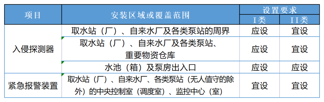 取水站(厂)、自来水厂及各类泵站的周界、重要物资仓库 、水池(箱)及泵房出入口、中央控制室(调度室)、 监控中心(室)