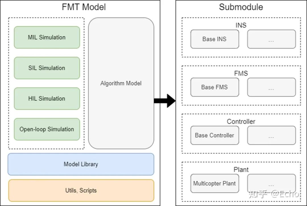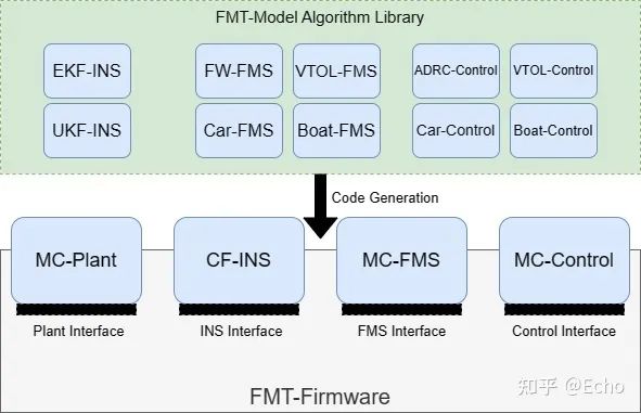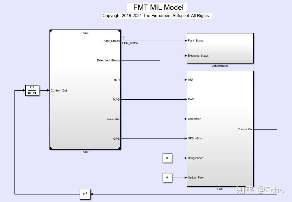 FMT-Model: 飞控算法模型框架。包含了基于 Matlab/Simulink 实现的算法模型,如导航,控制,状态机,被控对象模型等。算法模型通过自动代码生成可以合入到 FMT-FW中,从而构成完整的飞控系统软件。