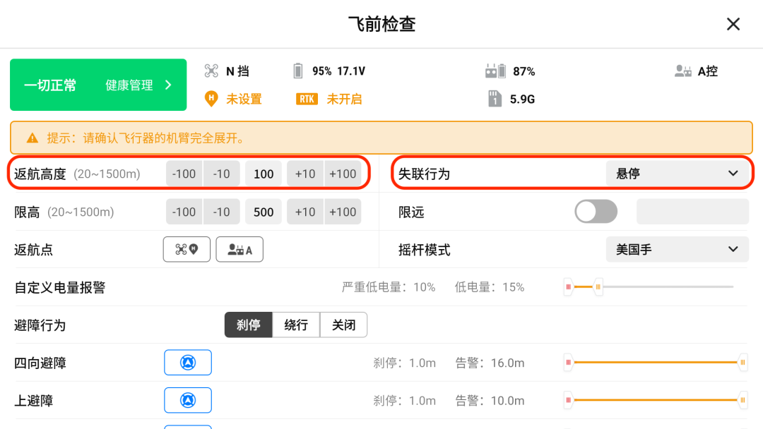 确保返航高度高于障碍物,失联行为可设置为“悬停”