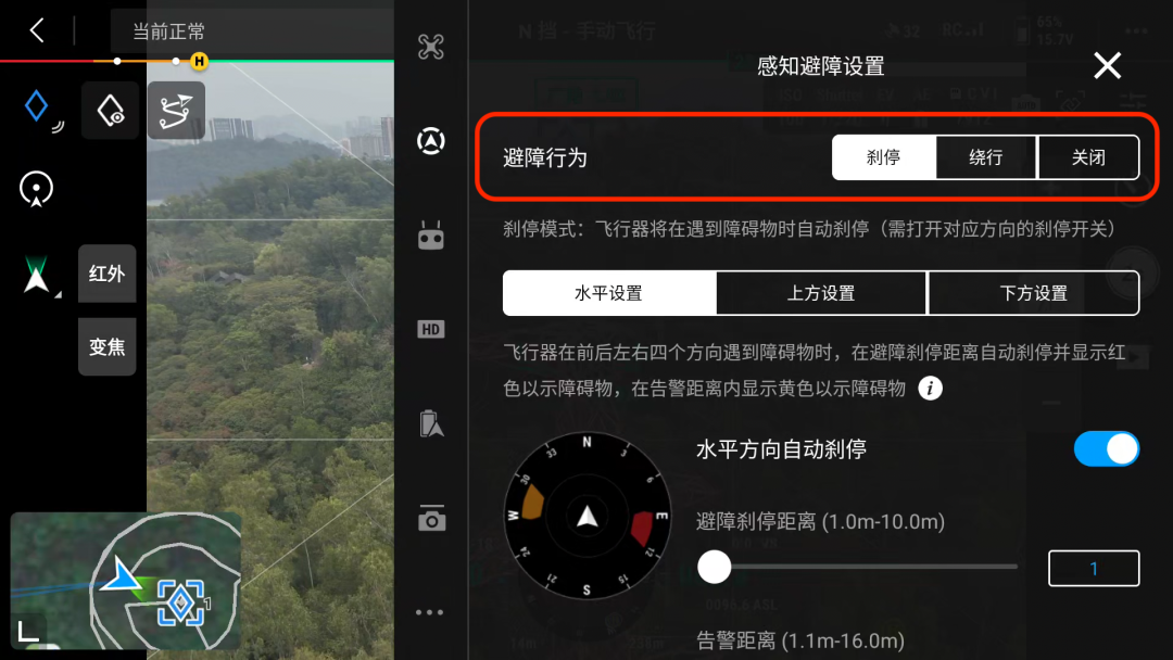 3、智能环绕过程中,在光照等环境条件满足视觉系统需求时,即使避障行为选择“绕行”,飞行器遇到障碍物依然会执行刹停行为。