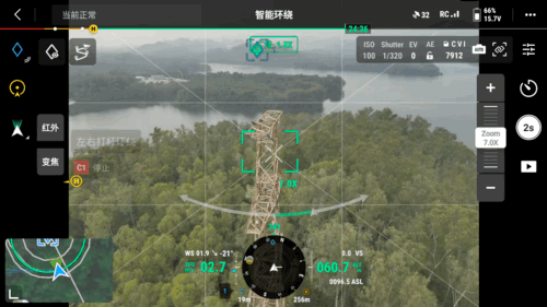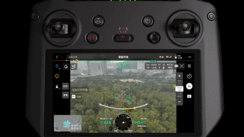 下一步,我们开始环绕飞行并调整飞行速度。开启智能环绕功能后,飞行界面中会出现环绕速度指示条,同时地图界面会显示绿色的环绕轨迹。操作右摇杆向左或向右,飞行器向相同方向开始环绕飞行。飞行过程中,可以通过点击画面图标或 C1 按键实现定速环绕,再次点击则解除定速。定速环绕飞行中,可通过摇杆手动调整飞行速度。搭配定时拍照和视频录制功能,智能环绕功能可满足目标巡检、建模拍摄等多种场景需求。