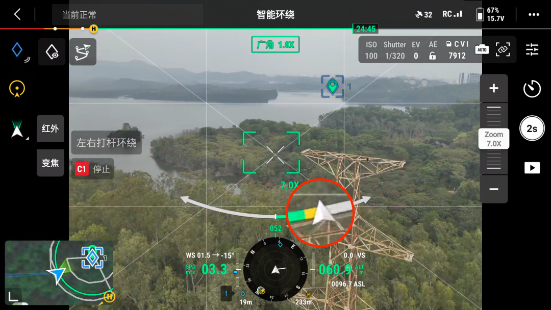 接下来,我们需要调整云台角度。确保飞行模式为 N 档,点击智能环绕图标,微调云台角度。大部份情况下,目标点都位于观察目标的上方,所以需要调整云台看向观察目标。