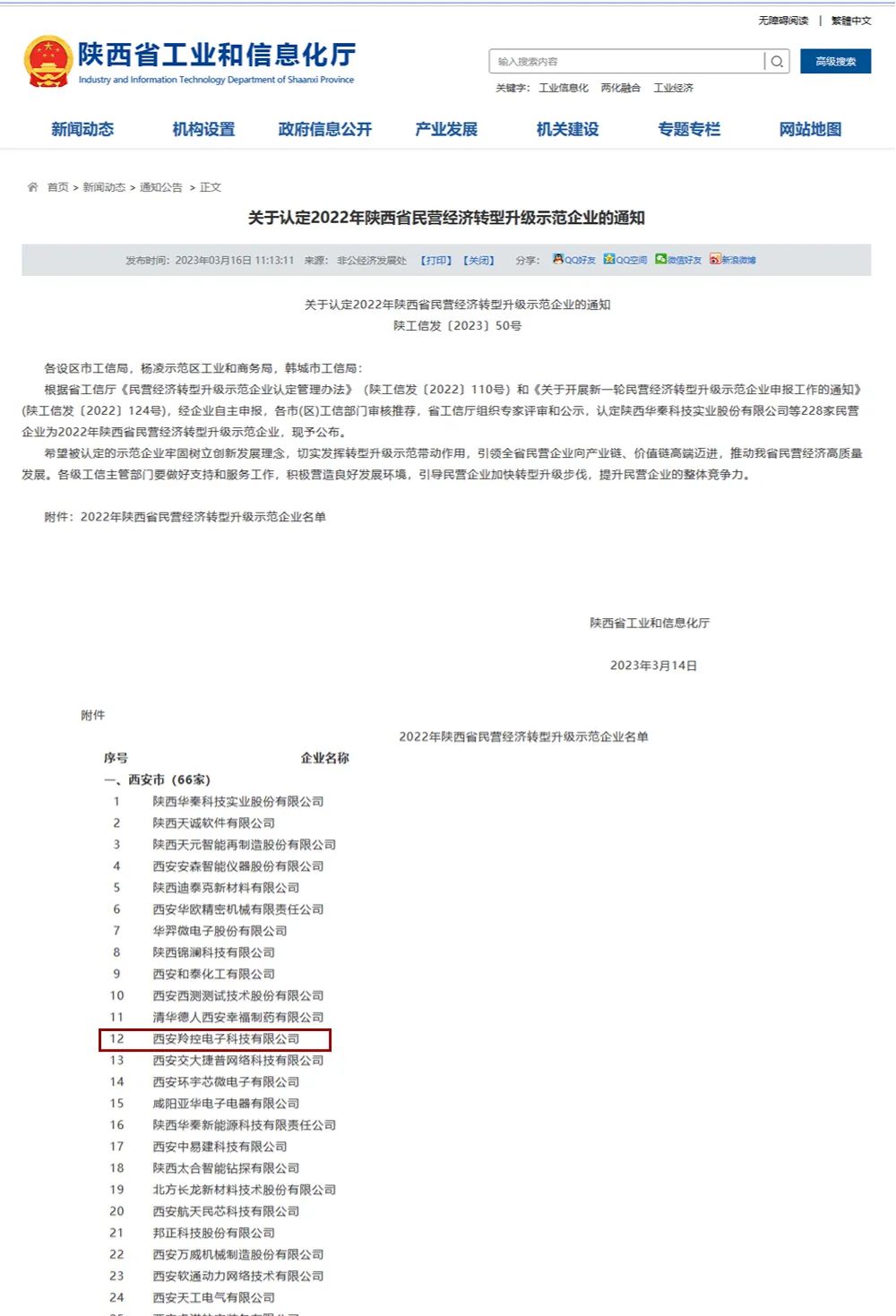 2023年3月16日,陕西省工业和信息化厅公布了“2022年陕西省民营经济转型升级示范企业”名单,西安羚控电子科技有限公司榜上有名,获评2022年度“陕西省民营经济转型升级示范企业”荣誉称号。