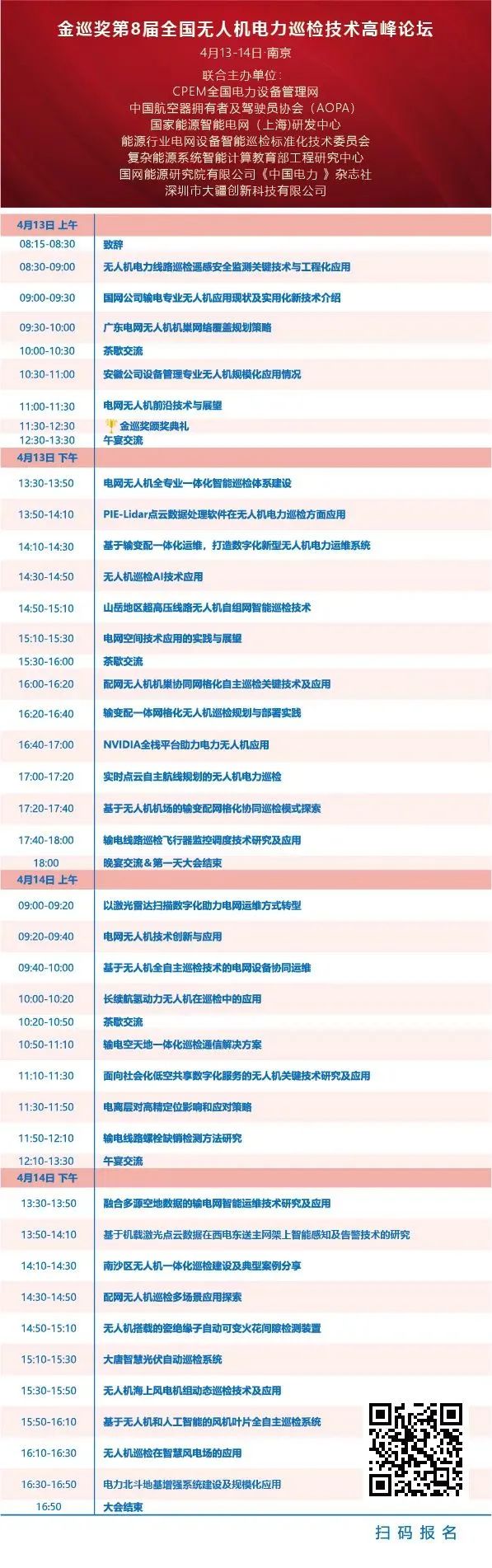 为进一步推广无人机在输电线路运检的专业化经验,创新应用,提高工作效率,解决无人机巡检过程中的实际难题,2023第8届全国无人机电力巡检技术高峰论坛暨「金巡奖」第5届全国电力巡检技术创新应用评选将于4月13日至14日在南京举办。