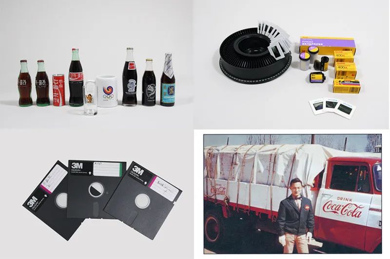 历史馆展示了当时斗山销售的食品饮料、生活用品和服装品牌的多种商品,可以了解这一时期国民的消费趋势。特别是展示了柯达的幻灯片和韩国3M的5.25英寸软盘等现在很难找到的产品,以及可口可乐100周年限量版等。