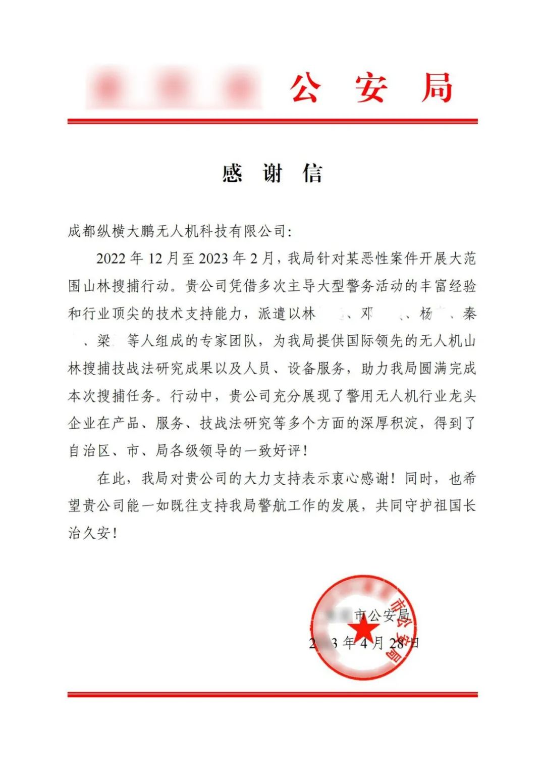 纵横股份在此次山林搜捕任务中展现了卓越的产品性能和深刻的行业应用理解,为当地公安顺利完成任务提供了有力支持,也得到了该公安局专门发函感谢: