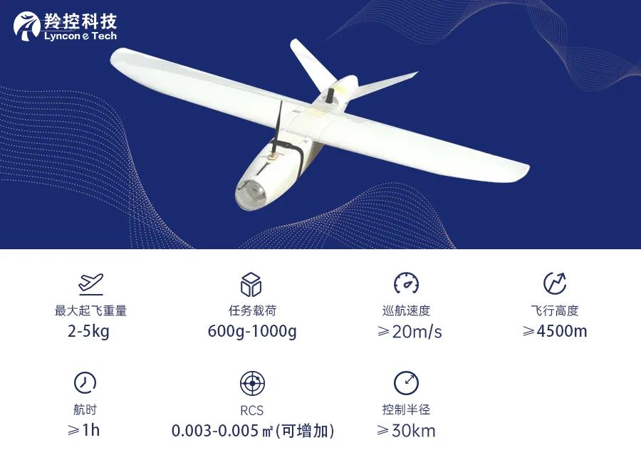 该机最大起飞重量2-5kg,任务载荷600g-1000g,巡航速度≥20m/s,航时≥1h,控制半径≥30km,飞行高度≥4500m,RCS0.003-0.005㎡(可增加)。