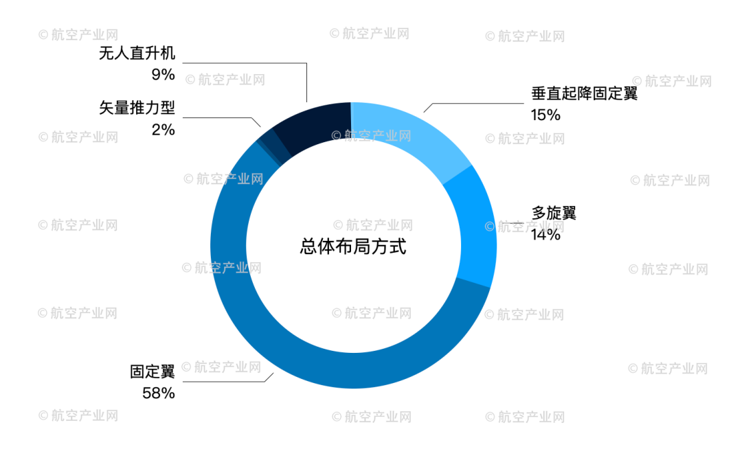 从总体布局方式上看,固定翼是占比最多的的布局方式,达 58%。由于良好的适用性,具有垂直起降的无人机是目前研发热点,垂直起降固定翼和倾转旋翼式等矢量推力布局方式正逐渐兴起。