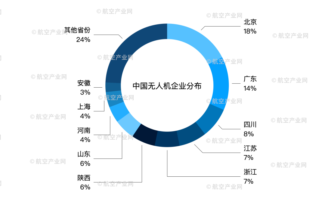 根据航空产业网的统计,从地理分布来看,我国目前无人机产业链企业在北京、四川、广东等三省市数量最多,其次是陕西、江苏、浙江等省份。