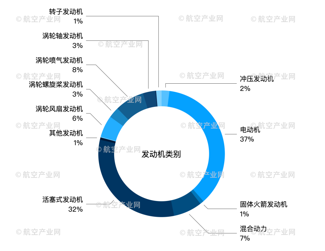 从动力装置的类别看,目前采用电动动力的无人机占比最高,达37%;其次是活塞式发动机,占比32%。根据航空产业网的数据分析,中大型无人机的动力装置与通航类似,有较强的共通性。随着电动技术的不断发展,电动推进和混合动力逐渐被广泛应用于无人机领域。