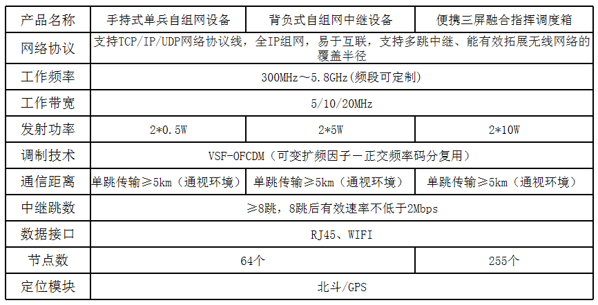 慧明捷自组网设备是一款采用VSF-OFCDM调制技术设计的移动宽带无线通信产品,产品采用无中心、分布式网络架构,支持任意网络拓扑、多跳中继、动态路由、抗毁性强。所有节点在静止/快速移动、遮挡等复杂应用场景下,实现多路语音、数据及视频等多媒体信息的实时传输;整个系统部署便捷,使用灵活,操作简单,维护方便,且全IP化设计(支持各种数据透传),易与异构通信系统互联互通;同时高度灵活的网络结构可实现节点之间的数据以点对点、多点对多点的方式传输,使得单兵通信设备的传输距离可通过自动中继功能达到成倍延伸。