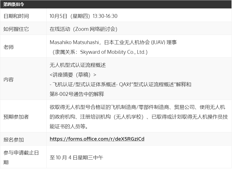 第4次指导将于10月5日举行。此次,我们以“无人机型式认证流程概述”为主题,根据8-002号通告,对无人机型式认证流程的基础知识进行指导。