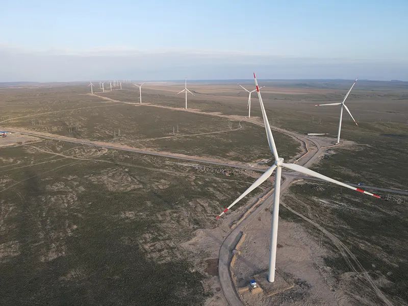 这是2021年4月25日在哈萨克斯坦扎纳塔斯拍摄的风电场风机(无人机照片)。扎纳塔斯风电项目于2018年列入中哈产能合作清单重点项目。新华社发(中国电建成都院供图)