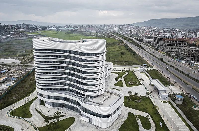 这是2023年9月10日在埃塞俄比亚首都亚的斯亚贝巴拍摄的非洲疾控中心总部大楼(无人机照片)。中国援非盟非洲疾病预防控制中心总部(一期)项目于2023年1月竣工,这是非洲大陆第一个拥有现代化办公和实验条件、设施完善的全非疾控中心。新华社记者 王冠森 摄