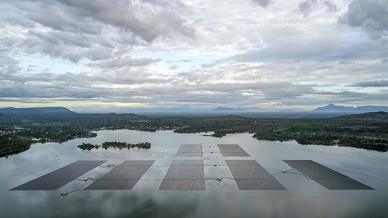 这是2022年12月8日在泰国乌汶府诗琳通水库拍摄的浮体光伏项目(无人机照片)。据介绍,该项目共安装光伏组件14.4万余片,总装机容量58.5兆瓦,每年可以减少4.7万吨二氧化碳排放,助力泰国减少对高污染火力发电的依赖。新华社记者 王腾 摄