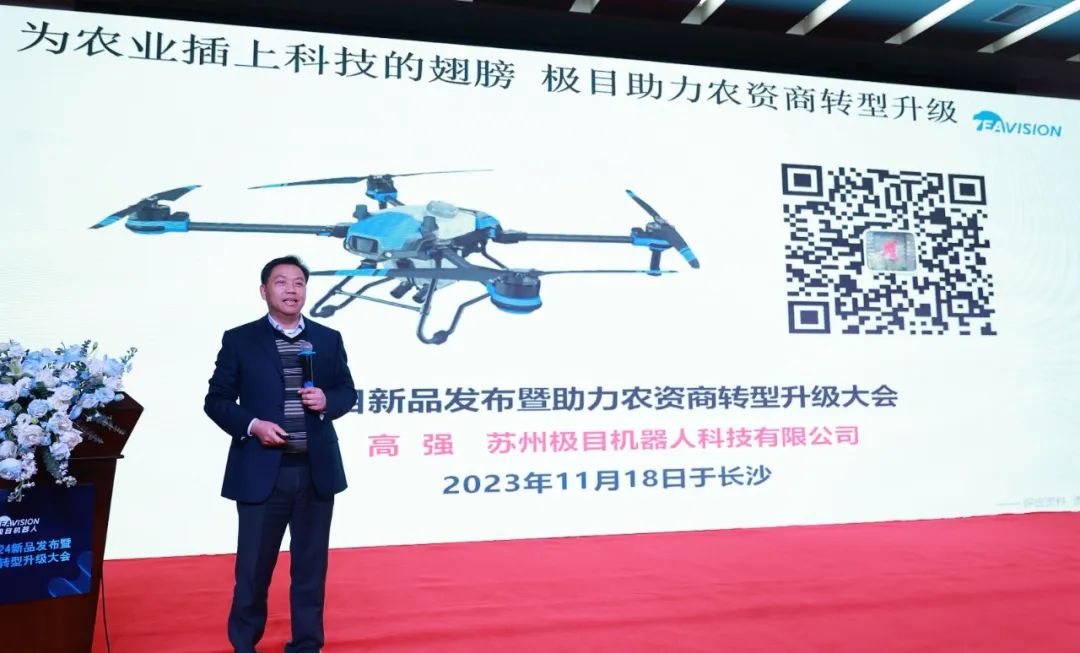 极目机器人农业事业部常务总裁高强与大家探讨:如何在农业现代化洪流中,共同为农业插上科技的翅膀?极目联合农资商共同探索“人+机+剂+技”系统方案,建立培训-飞防-维修-销售四位一体服务中心,通过智农系统等数字化赋能工具,助力传统贸易型农资商向科技型农服商转型,赋能农业产业化。