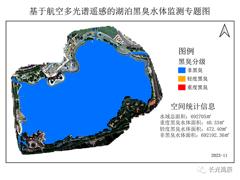 使用Yusense Map Plus分别进行富营养化与黑臭水分析,可以看出本案例所选湖泊整体呈现轻度富营养化情况,局部出现中度富营养化情况,与目视评估水色以及光谱曲线中红边波段反射较高的情况匹配程度较高,同时无黑臭水体污染,整体表明使用DOM填充方法对光谱属性影响较小,可以满足水体监测需求。