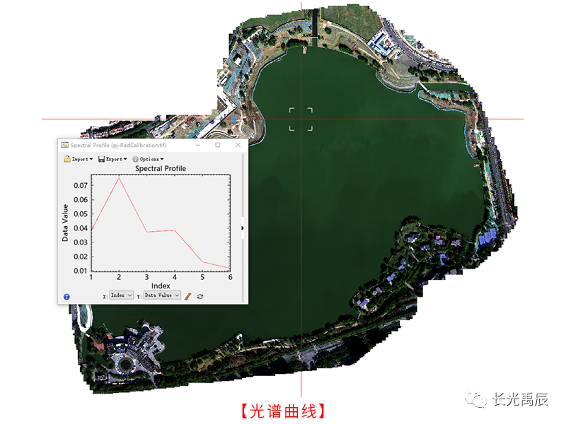 使用Yusense Map软件分步执行波段配准、二维建图*、反射率校正,得到最终具有反射率意义的拼接影像,其中水面部分已进行DOM填充,实现了完整的正射建图,同时使用Yusense Map Plus查看水体光谱特征曲线,符合水体光谱反射特征。
