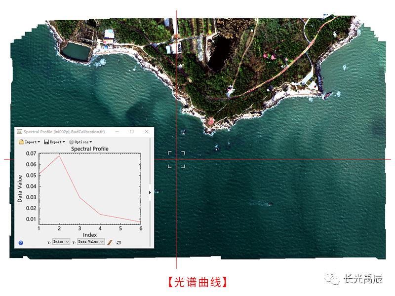 使用Yusense Map软件分步执行波段配准、二维建图*、反射率校正,得到最终具有反射率意义的拼接影像,其中水面部分已进行DOM填充。此海岸线属外海区域,海面波浪明显,拼接影像中存在大量波浪与浪花,一定程度影响数据分析,使用Yusense Map Plus查看无波浪水体光谱特征曲线,符合水体光谱反射特征。