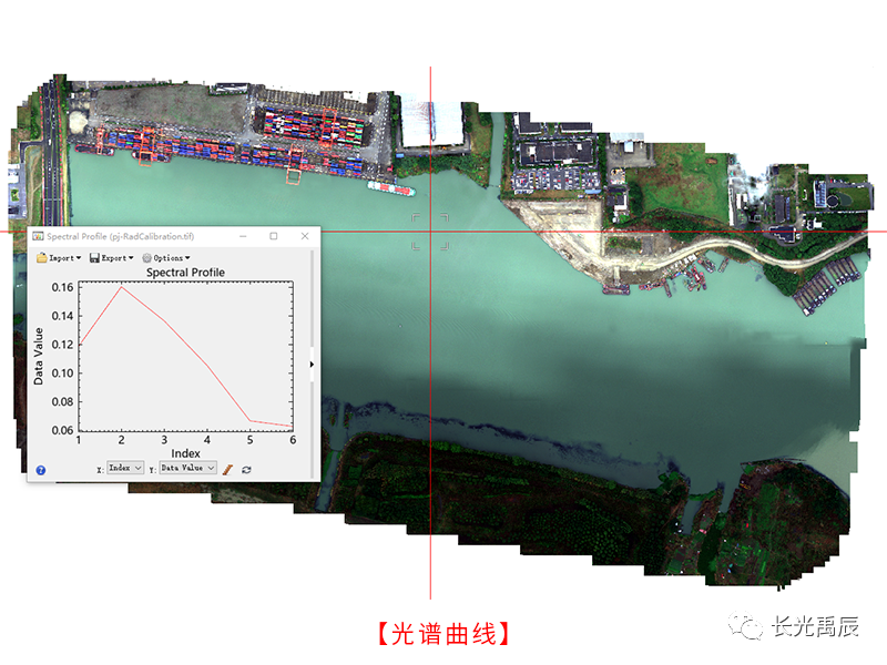 使用Yusense Map软件分步执行波段配准、二维建图*、反射率校正,得到最终具有反射率意义的拼接影像,其中水面部分已进行DOM填充,但受水面船只频繁运动的影响,拼接影像中会存在波浪,一定程度影响数据分析,使用Yusense Map Plus查看无波浪水体光谱特征曲线,符合水体光谱反射特征。