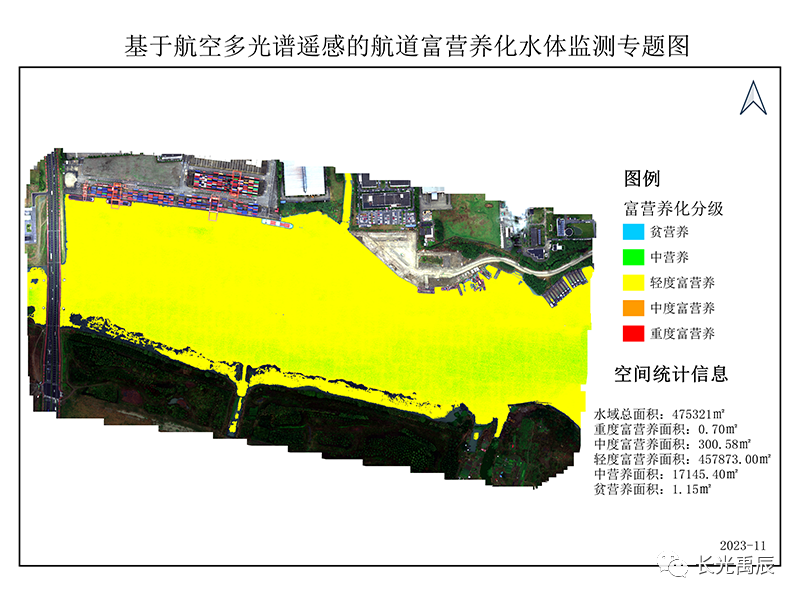 点云分布&拼接结果&光谱曲使用Yusense Map Plus分别进行富营养化与黑臭水分析,可以看出本案例所选航道整体呈现轻度富营养化情况,主要原因是水面整体均呈现较高的反射特征,与常规水体差异明显,且实际水色偏绿,与实际情况匹配度较高,同时无黑臭水体污染,整体表明使用DOM填充方法对光谱属性影响较小,可以满足水体监测需求。