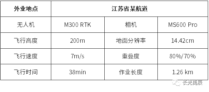 本案例选取江苏省某通航河道作为实验目标,水面宽度300m~450m,使用M300 RTK无人机搭载长光禹辰自主研发的6通道多光谱相机MS600 Pro,获取了航道与两侧岸线影像,具体外业情况见下表: