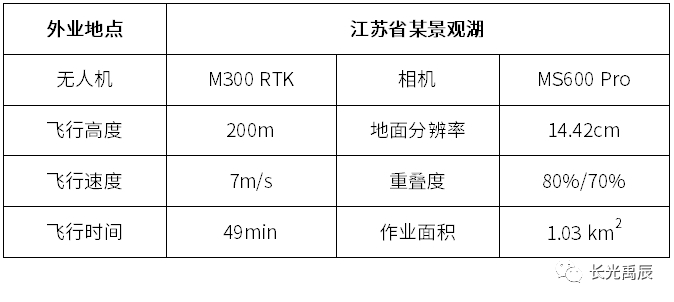 本案例选取江苏省某湖泊作为实验目标,使用M300 RTK无人机搭载长光禹辰自主研发的6通道多光谱相机MS600 Pro,获取了完整湖泊与岸线影像,具体外业情况见下表:
