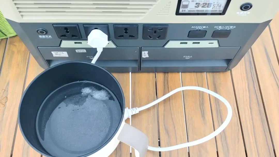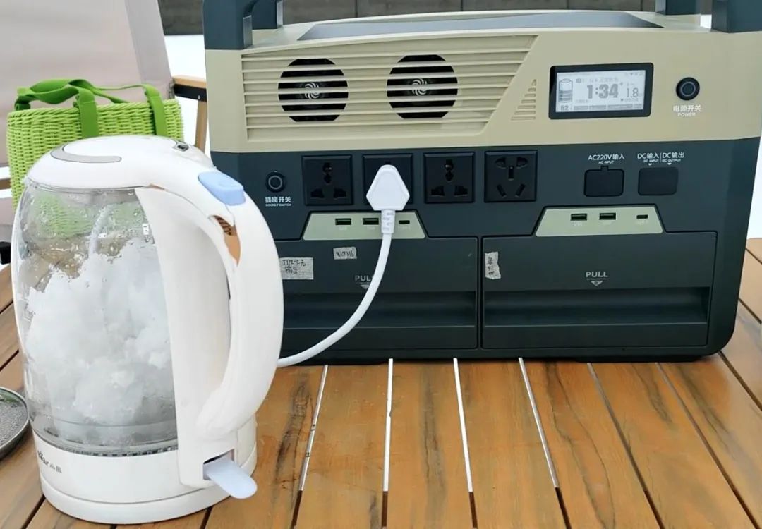 接下来,我们测试了一下更大功率的一款烧水壶,这是一把1800W的大功率烧水壶。就地取材灌上雪之后,启动储能便携电站电源开始烧水,功率逐渐升高,最高达到了1800w,热水很快烧开了,一切正常。