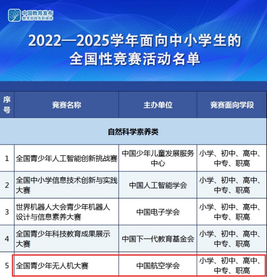 由中国航空学会主办的面向全国青少年的无人机专项创新赛事,历届大赛总参赛选手累计逾12万人,连续入选教育部赛事活动“白名单”,已成为我国青少年无人机领域具有权威性、专业性、公正性以及影响力的全国性比赛。大赛活动旨在提升青少年的动手动脑能力,激发青少年探索航空未来的创造力与想象力,促进青少年人工智能学习的积极性,在人工智能时代背景下培养航空创新后备人才,为实现中国航空强国梦奠定基础。