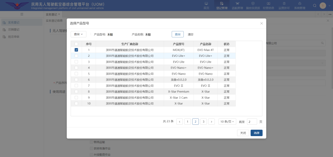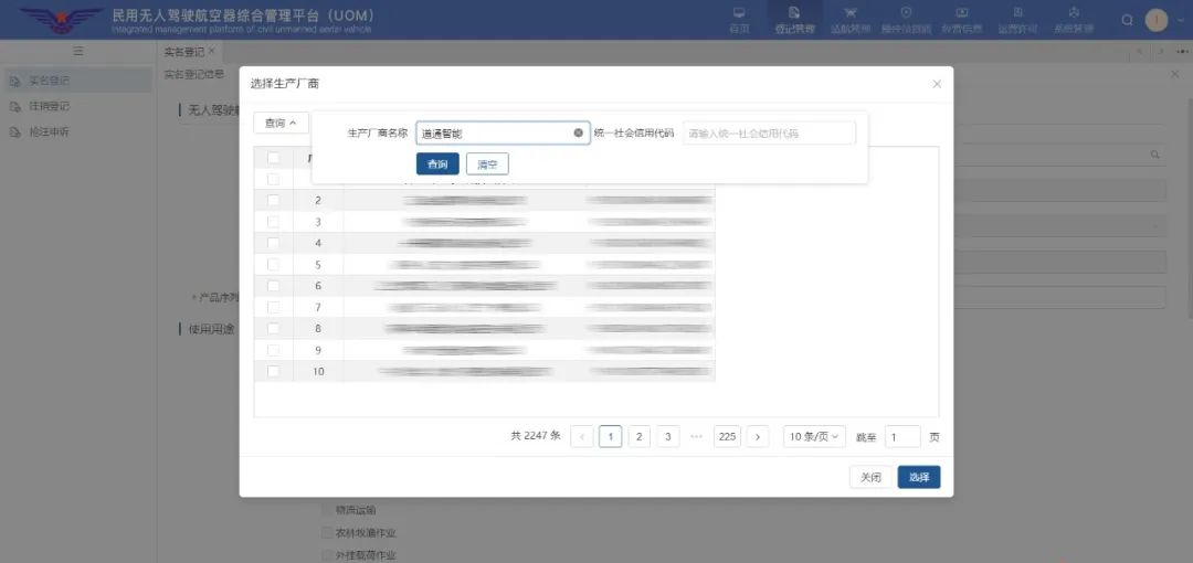 ▼以道通智能产品为例,在弹出的生产厂商列表中,点击左上角[查询] 按钮,在[生产厂商名称] 输入框中输入关键词“道通智能”。