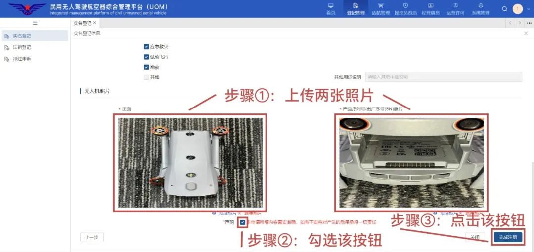 ▼最后,根据要求拍摄并上传 [正面] 、[产品序列号/出厂序号(SN)照片] 两张无人机照片。勾选[声明 - 内容真实准确] 按钮,点击右下角蓝色[完成注册] 按钮,即可完成实名注册登记流程。