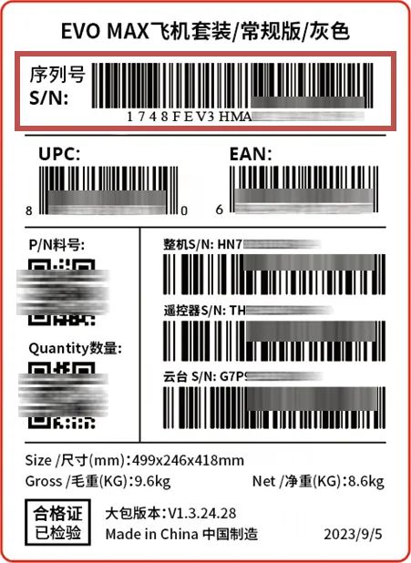 ▼方式一:外包装箱。在产品外包装箱条形码合集贴纸中,位于条形码标识 - 序列号S/N(如:EVO Max 4T/4N)、Serial No(如:EVO II 系列)、Aircraft(如:EVO Lite系列、EVO Nano系列)下方的数字+字母组合。