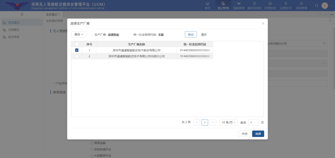▼点击蓝色[查询] 按钮,在搜索结果中,勾选序号1对应的名称“深圳市道通智能航空技术股份有限公司”,点击右下角蓝色[选择] 按钮。