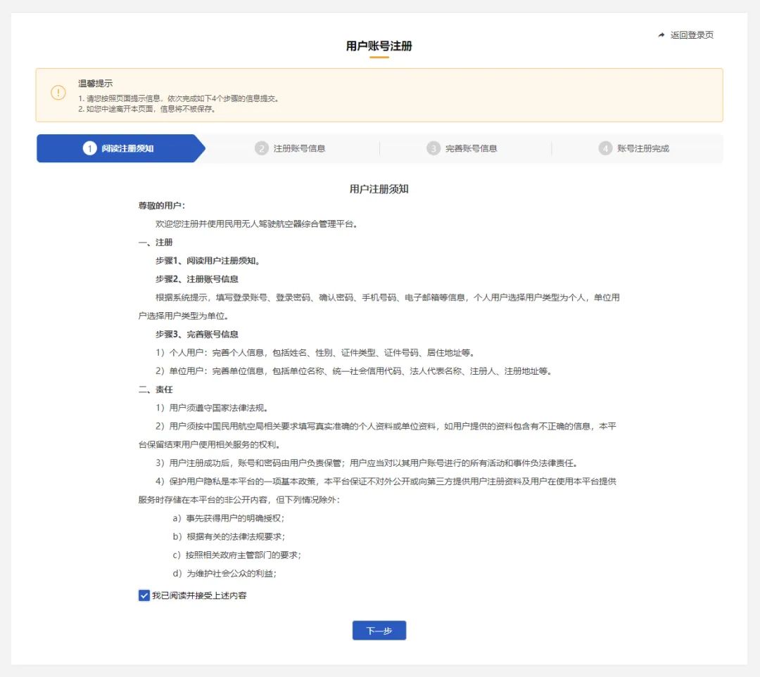 ▼点击UOM平台首页 [免费注册] 按钮,阅读用户注册须知并勾选 [我已阅读并接受上述内容] ,点击[下一步]按钮。