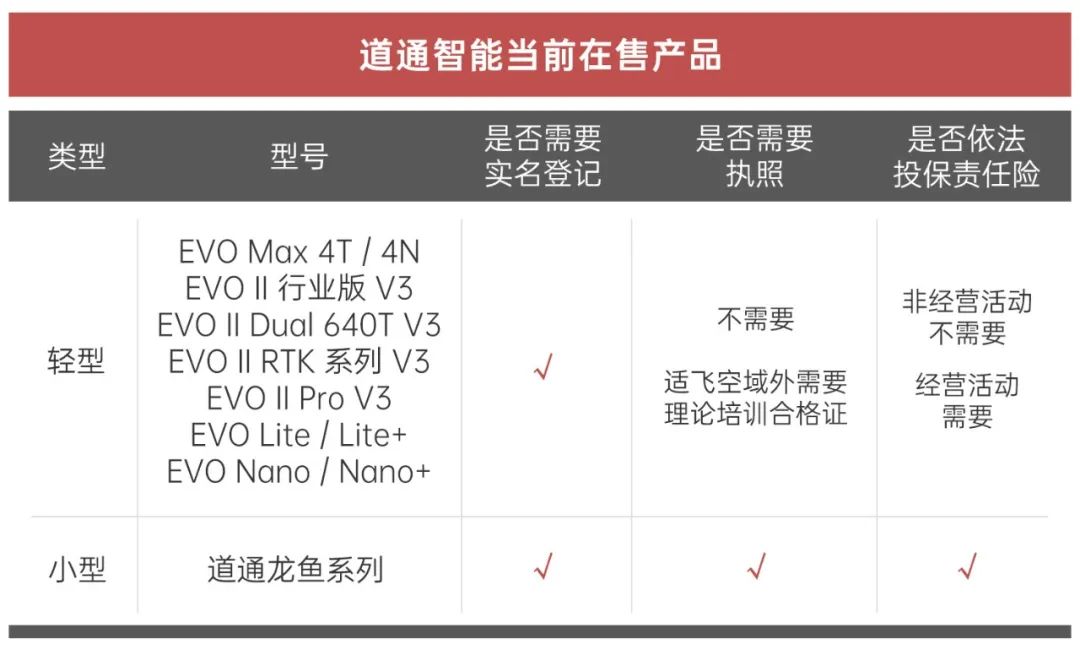 其中,道通智能旗下行业级多旋翼 EVO Max 4T/4N、EVO II 行业版 V3、EVO II Dual 640T V3、EVO II RTK 系列 V3,以及消费级多旋翼 EVO II Pro V3、EVO Lite系列、EVO Nano系列均属于轻型无人机;行业级倾转旋翼 道通龙鱼系列属于小型无人机。