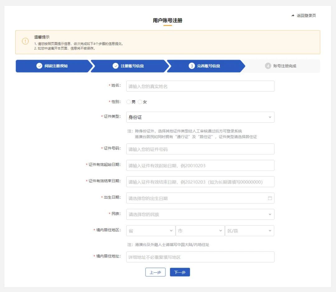 ▼完善账号信号,包含:姓名、性别、证件类型、证件号码、证件有效起始时间&结束时间、出生日期、民族、境内居住地区、境内居住地址,填写完成后点击 [下一步] 按钮。