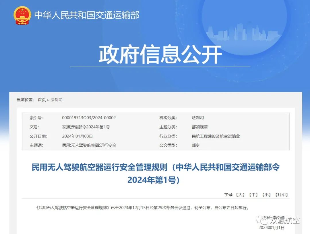 《民用无人驾驶航空器运行安全管理规则》已于2023年12月15日经第29次部务会议通过,现予公布,自公布之日起施行。